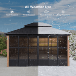 - Material: Wood Grain Aluminum Frame & Galvanized Steel Roof