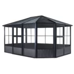 Transform your backyard with the addition of the Charleston solarium. This extension to your home will provide the needed space to gather all your loved ones for an evening of dining and relaxation or it can be used as the perfect shelter for your hot tub. The Charleston boasts a solid aluminum frame with elegant galvanized-steel roof panels. This beautiful addition to your outdoor living space will shelter you from the elements for years to come while adding value to your property.Features premium Interpon AkzoNobel powder coating for maximum protection. Durable and corrosion resistant, premium powder coated dark grey aluminum frame. Premium powder coated galvanized steel roof panels help protect against harmful UV rays. Features 2 single sliding doors with flexible install locations. 3-Position PVC (mica) sliding windows with mosquito netting offer additional ventilation. Although an all-season solarium, any accumulation of snow should always be removed from the roof. DIY assembly with no special tools required
